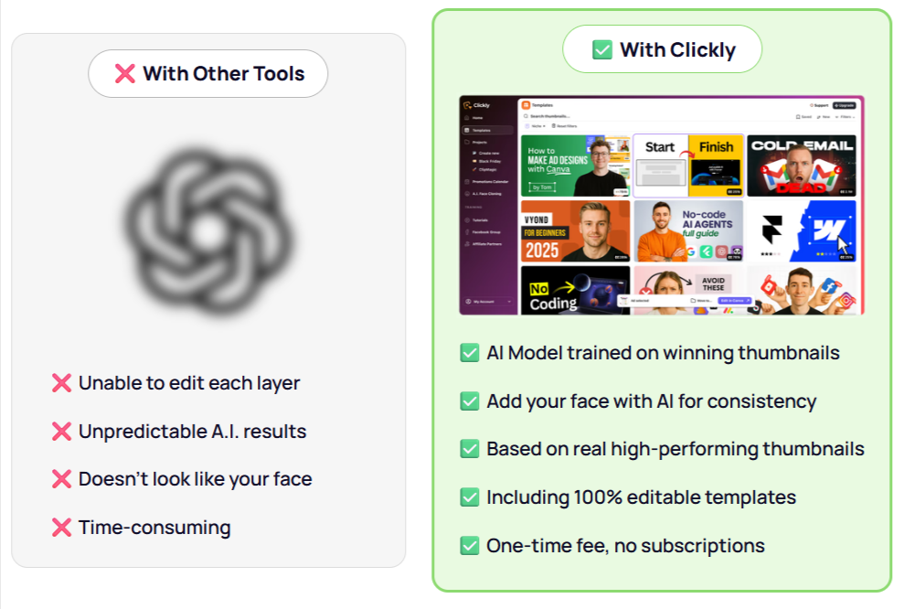 Simply drop your Youtube video url into Clickly, and our AI analyses the content and creates click boosting thumbnails with your face in less than 60 seconds.