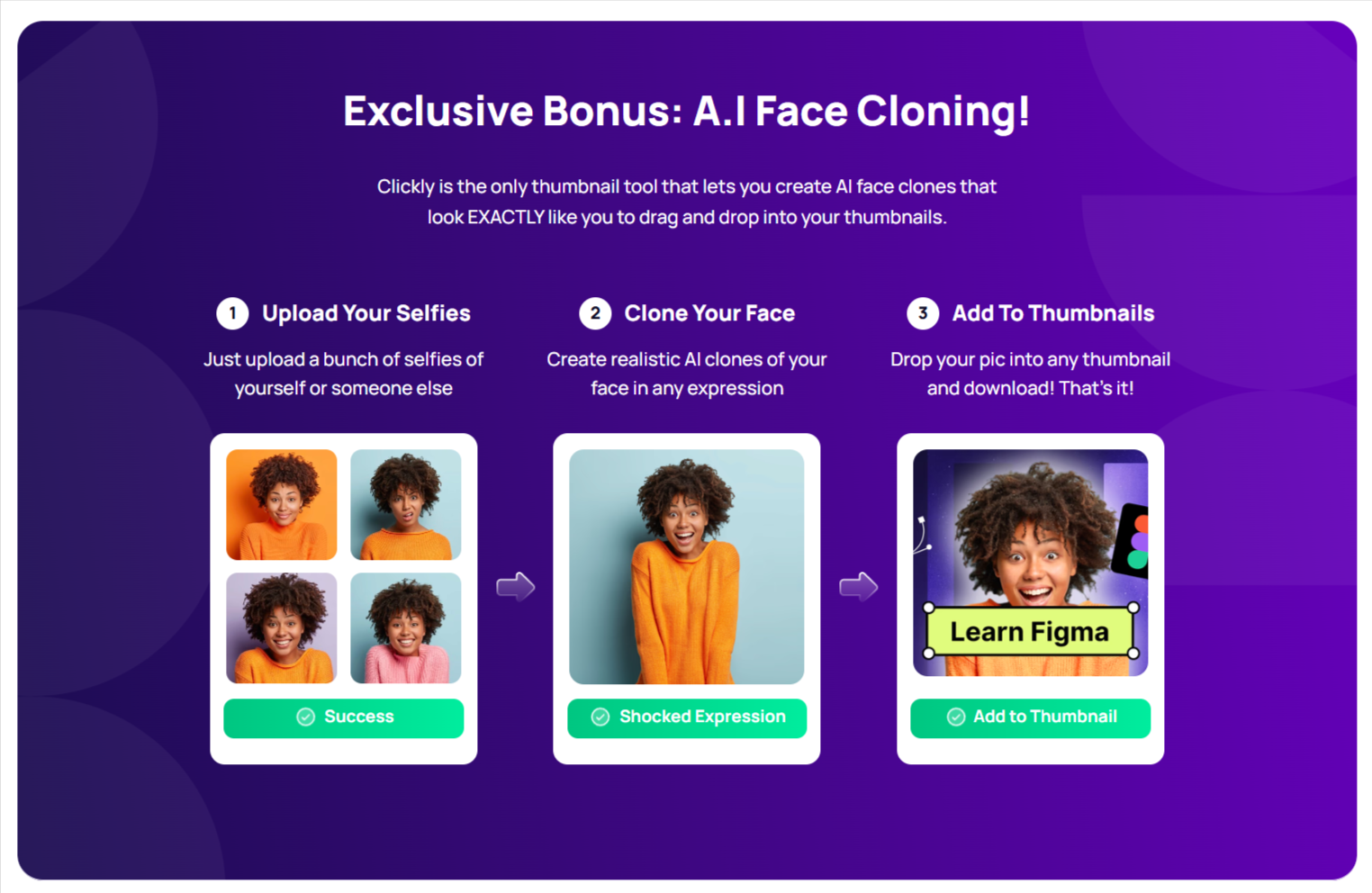 Users can AI-clone their own face and generate ultra-realistic expressions, poses, and angles, then instantly drop them into any thumbnail design!